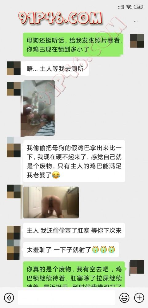 闲来无事看手机,突然看到绿王八给我发微信发骚,邀请我过几天去他家住,想让我艹她老婆,母狗也是满足不了天天没给他好脸色,刚好也碰上母狗有假期,所以催着绿王八给我发微信,没想到绿王八发了母狗自慰的照片给我看。这还不够,鸡巴锁的照片也发给我了,上次调教完让他带锁,钥匙给了他老婆,看来他老婆快完全沦为我的狗了,只听我的话了,钥匙也不给他了,哈哈哈,没想到他自己还带了肛塞和项圈跑到厕所给我拍了下,真的有够贱,晚上没事发出来让大家看看,等有空去他家住几天再调教一下
