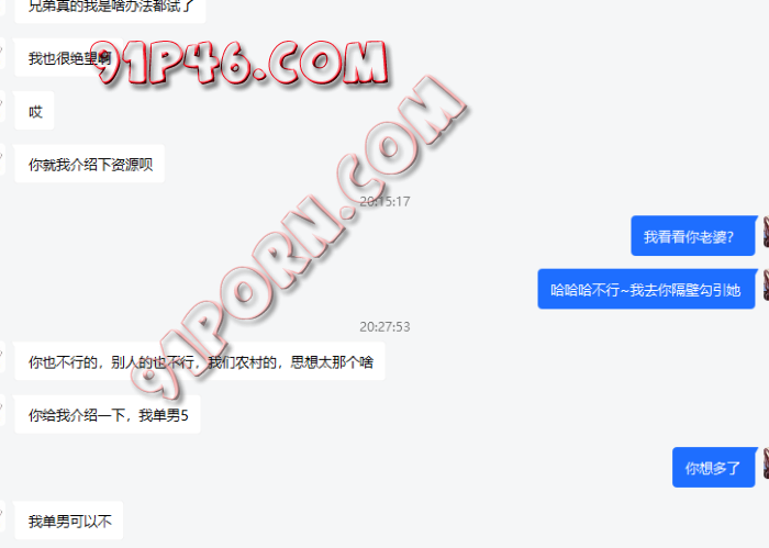 B搞死都不说到什么程度了,就只说一年都在说,妻子不同意,又说是农村的,最后竟然说老婆做爱的时他拍照都不同意【这都不同意,还想着人,4人????我不李姐】。【最后发现他说的都是骗局,刚开始没有结束对话是因为B老婆微胖极品,想多聊聊,能开发出来那肯定很nice】