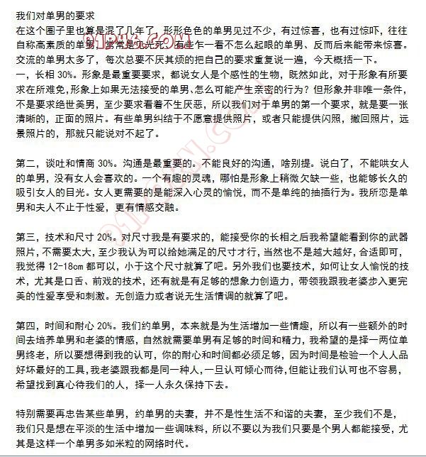 之前帖子发了以后很多单男联系。有优秀的,也有各种牛鬼蛇神。这里盗用别人两张图,单男可以参考下。不要乱加了。