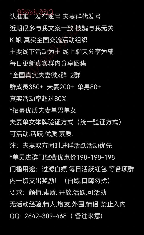替群内朋友发一个帖子:淮安真实夫妻42.36,妻身材高,偏丰满,水超级多。夫有绿帽倾向,能接受在一起的各种配合刺激。想处异地的长期保持关系的靠谱单男,平时可以作为好朋友一样走动走动!妻喜欢大叔类型的,要求男方年龄成熟点,健康有素质。经济实力优!具体私聊:q:1987445077。骗子嘴炮垃圾勿扰! .