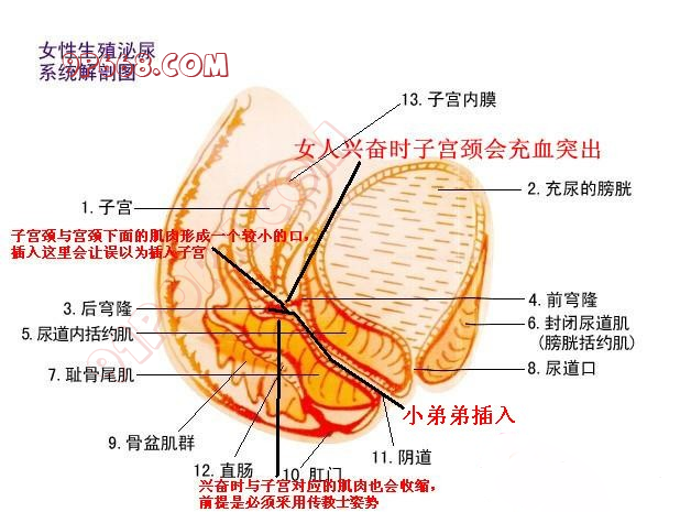 3再看图最左边的文字说明,这个时候延伸的宫颈与充血的阴道下壁肌肉同时作用形成一个比较狭小的内口(上下夹击0),当你的小弟弟够长,小弟我的16CM,你就可以完全插入这个口(就像一个山洞里面,最里面的洞上面悬挂这个大肉球(突出的子宫颈),下面是可以收缩的肌肉,你的鸡鸡就插入这)