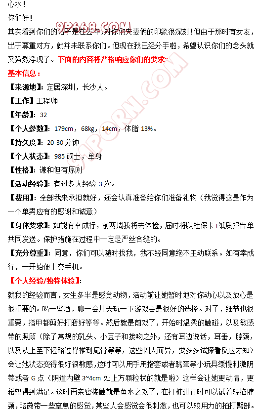 要求挺详细的,应该是个真实玩家,长沙优质单男路过,有需要随时联系~