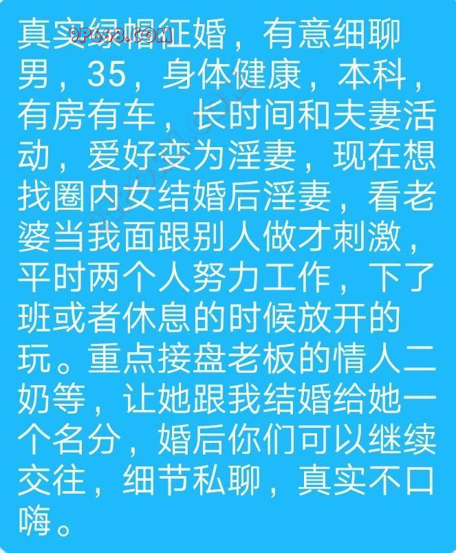 真实绿帽征婚,有意细聊 男,35,身体健康,本科,有房有车,长时间和夫妻活动,爱好变为淫妻,现在想找圈内女结婚后淫妻,看老婆当我面跟别人做才刺激,平时两个人努力工作,下了班或者休息的时候放开的玩。重点接盘老板的情人二奶等,让她跟我结婚给她一个名分,婚后你们可以继续交往,具体细节私聊:②①⓪⑨⑧⑥⑨⓪⑥,真实不口嗨。 .