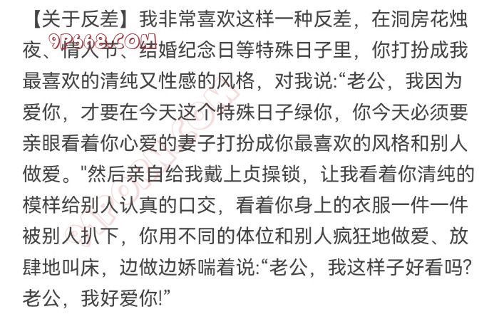 “在结婚纪念日等特殊日子里,我打扮成你最喜欢的清纯又性感的风格,对你说:老公,我因为爱你,才要在今天这个特殊日子绿你~~~~~~”,