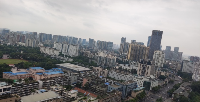 上海吧。关键线索,从照片来看,没有山。学校里面有个雕塑。暴雨。楼顶有植被。