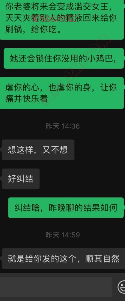 下面是和一个绿奴兄弟的聊天记录,加他好友四五年了,一直想做绿奴,奈何老婆一直不同意。这段时间他老婆蠢蠢欲动,他缺想退缩了。命运的齿轮开始转动剧情翻转。有过经验的可以说一下。企鹅3157432147