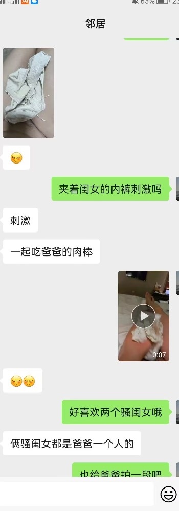 邻居单身,一儿一女,闺女17,儿子11,和我在一个小区,邻居操了两年了一开始就开始调教她幻想闺女也加入,今年才有所突破,啥都可以说,她闺女内裤现在都是我买,旧的内裤她旧说扔了,其实给我了。妈妈是完全同意我操闺女了,接受度极高。(我称呼她大闺女,称呼她女儿小闺女)。今晚她拿闺女内裤自慰了。正在聊天。 .