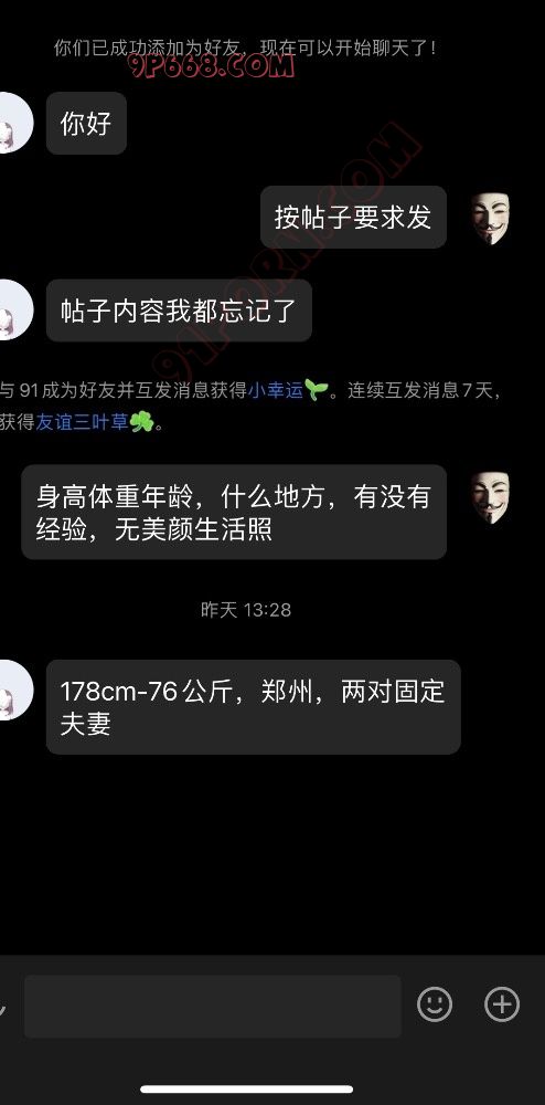楼主展示的素质单男聊天方式确实很有科研人员的素养,上来先把自己的情况用一段话整体详细进行介绍,随后在发照片之前先确认好夫妻是否方便看照片。在交流过程中,时间地点、自己的形成安排等信息传达的非常准确。