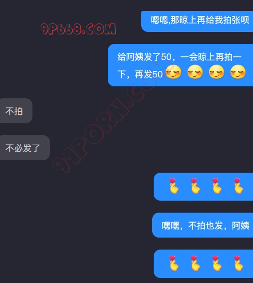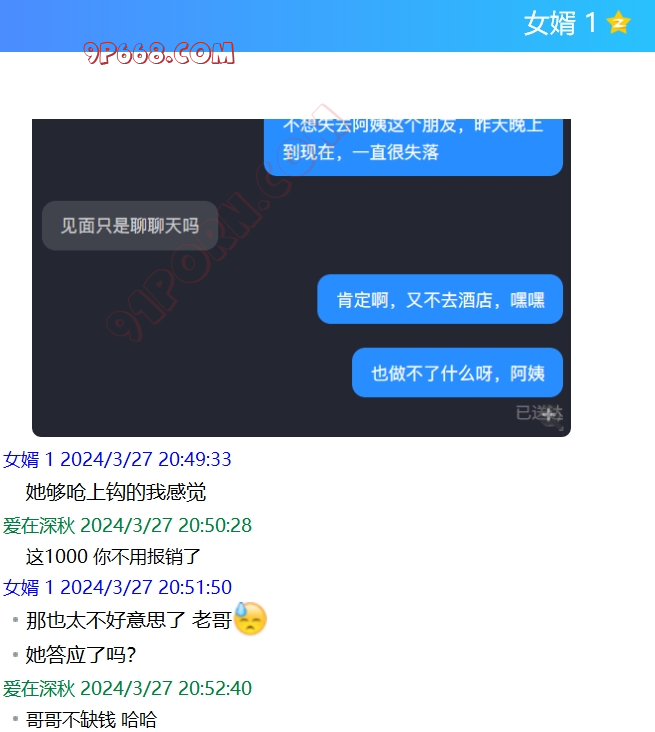 昨天做了一件错事,惹她生气了,说好让她拍一个穿过的内裤,然后放在洗手间,再拍一张,故意让她看看女婿动不动,结果她拍完第一张,把内裤洗了,我于是发了50,说再拍张晾上的照片,再发50,当时考虑不妥当,惹她生气了。人家确实也不缺这点钱,今天哄了一天没理我,今天正好来她城市出差,给她准备了1000现金,说当面道歉,她答应见我了。以前红包都是女婿给报销,明天这1000不用了,他刚工作不久,私房钱也不多。