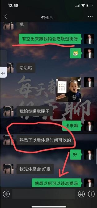 因为我之前就有个判断,这个妹子应该是比较好约的,所以我第二天没聊几句又开始邀约了。你在聊天过程中一定是先有判断再去做一些事情,而不是一直都是固定的一套方式。假如我觉得这个妹子有一点点提防心,我绝对不会一天到晚去邀约她,这样会让她觉得反感。当她说熟悉以后可以见面,我这个时候趁机提出另一个问题“熟悉以后可以谈恋爱吗?”其实问她谈恋爱也算是一种邀约,邀请她跟我谈恋爱。