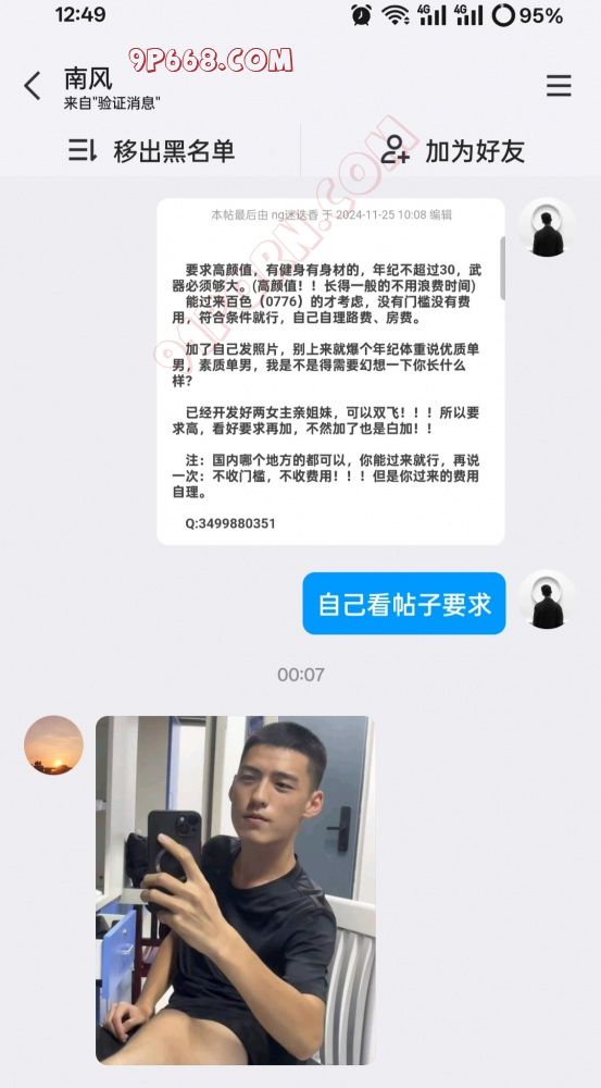 加了自己发照片,别上来就爆个年纪体重说优质单男,素质单男,我是不是得需要幻想一下你长什么样?