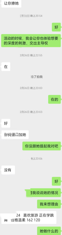 陆陆续续给新手夫妻开发了不少,有成功有失败,最快一周最慢三年,这次是创了新纪录。老公把老婆微信给我,假装加错联系上,当晚聊自慰,第二天聊受不了,把老公微信给我,三人群老婆直接在群里释放自我。聊天太长,先放第一段,过两天发更刺激的第二段。