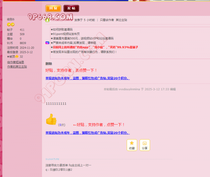 24年11月20日到现在发了500贴,白天发晚上发凌晨发?每次发帖不久就删除,也没有验证贴你还不让人质疑你是骗子? 你要收门槛是正常的,你发帖的这个频率?你既然说你是真实的,麻烦你以后每次发帖都带时间ID验证水印图好吗?也不要解释,也可以打破别人的质疑。 每次发帖都是这几个图,反反复复,删了又发?生产队的牛都没你媳妇这么能干,白天到黑夜不眠不休