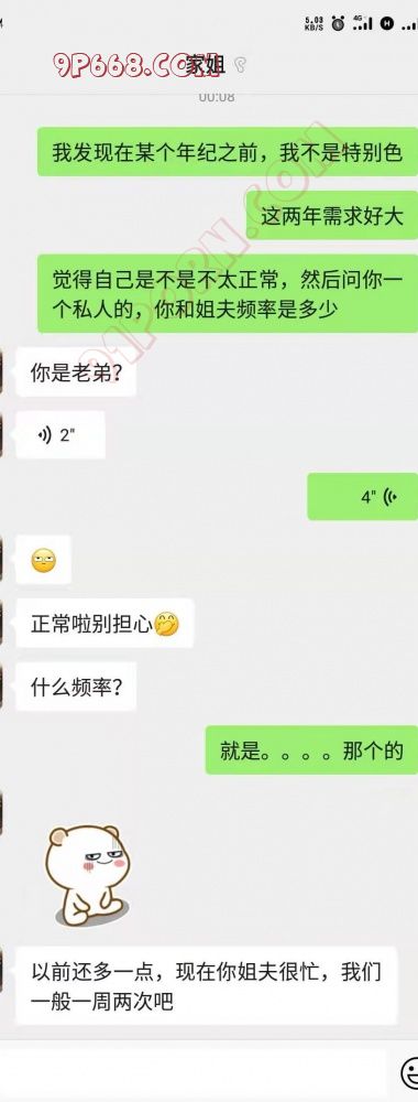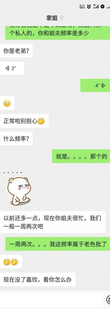 接上面,之前我们已经顺利从恋爱话题过渡到性,姐姐还很正经的让分手就不要再复合,开导弟弟有需求很正常。殊不知我们是项庄舞剑,意在沛公我让他把话题进一步深化,就像一个刚接触性的懵懂少年,说自己在某个时间突然对性有很强的欲望,充满疑问,遂向自己的好姐姐咨询讨教。姐姐自然会说正常,色弟弟随机询问她和姐夫的做爱频率。姐姐一开始怀疑了一下,说实话当时我也懵了一会儿。好在反应迅速,让他发段语音,打消疑虑4677506