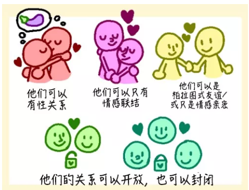 4、开放式关系:在彼此同意的前提下与他人发生关系,是否投入情感由双方共同决定,双方相互严格限制,设定边界,分清主次,原有关系占绝对主导地位。