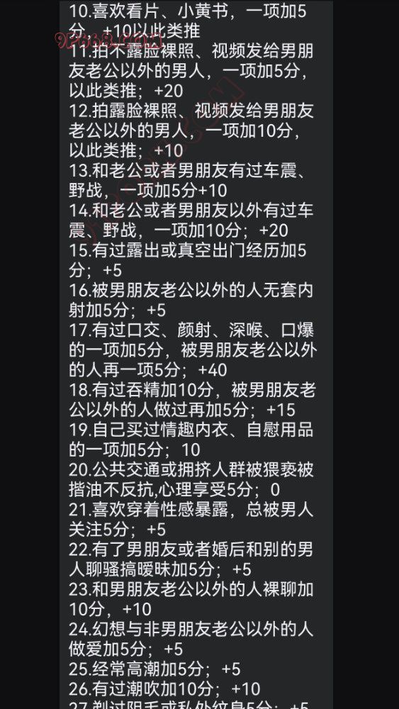 12.拍露脸裸照、视频发给男朋友老公以外的男人,一项加10分,以此类推;