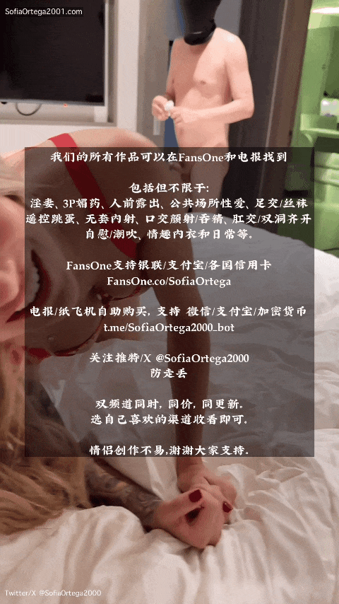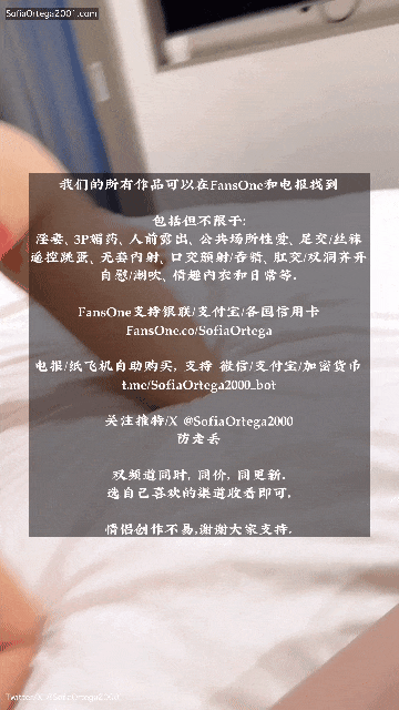 ------------------------------------------------------ 欢迎关注推特/X 和电报,以保持对最新作品的关注。 Twitter/X: @SofiaOrtega2000 Twitter/X: @JacksonYan444 (我) 免费电报咨询群邀请链接: ----------------------------------------------------- 在性爱的广阔族谱上,每个人都有独特的癖好与审美。 有人追求飞机场,有人沉迷大波妹,有人迷恋于翘臀,有人看脸为王道。 然而,有钱人的世界往往更加扭曲变态。 他们挥金如土,追求着极致的感官体验, 在他们眼中,满意的外貌,只是其一。 更深层次的精神体验,才是他们追随的目标。 金主对我们的诉求看似简单,但却让我实则吃尽了苦头。 1,Jackson(我),只能看不能加入。 2,金主要求携带另一个人,参与这场碰撞。 我由于想挖掘金主脑海中更深层次的原因,便问他为何如此选择。 金主也直言不讳告知, “你们的内容我看过,都是你与索菲的性交结束,但我就是想看你不能参与时的状态。” 我想了想也就觉得有些新鲜。确实,平时都是索菲在操完别人后被我内射或颜射。 随答应。 但金主也没强求,继续补充到。 “我只是要求你不要主动参与,但如果索菲强烈要求,那么女士的意愿优先。” 而《爸爸的诉求》便是在如此背景之下诞生了。 我们的作品包括但不限于。 • 交换 • NTR/绿帽 • 3P • 偷窥 •人前露出 • 公共场所性爱 • 足交/丝袜 •人前遥控跳蛋 • 无套内射 • 口交颜射/吞精 • 肛交/双洞齐开 • 自慰/潮吹 • 情趣内衣 • 日常等。 ----------------------------------------------------- 《爸爸的诉求》 [85GIFs] 正式开始 原视频为 1080P已经登陆电报和FansOne,动图画质偏低,请见谅。 金主没有操之过急,而是选择了先暖场, 另人拿起震动棒开始为索菲热身。 震动棒之威力,非人所能及也。 索菲随之发出的呻吟点燃了爸爸的欲火。 时过才半分,金主便发号施令决定时机成熟。 “那我不客气了。”索菲也表示。 索菲一时间还没搞清楚状况冲我问:“所以谁先?” 但两位脱光之速,迅雷不及掩耳。 下一秒,爱人已经手温柔的引导金主进入自己的口腔。 他觉得站了一会可能觉得有些累,拿个枕头躺了下去。 金主示意索菲上来一些, 但她早已享受在另一人的夹击之下吸吮着爸爸的屌。一时没注意到。 金主挽起了爱人的长发,好让自己可以看清索菲的每一次吸吮。 索菲也开始把小爸爸从口腔推入喉咙。哽咽声迎面扑来。 我刚说换个角度拍一下, 但后面的助攻手在见识了震动棒的威力后,按耐不住了。 “嗞嗞嗞。”后方震动的酥麻传遍全身。 她的哽咽声中,夹杂着呻吟。更加奋力地埋头狂吸,把自己的欲火释放在金主身上。 不知是不是金主爸爸的龟头太过于敏感, 他阻止了索菲的进一步动作,开始调整到自己的节奏。 不知道大家有们没有过这种体验。 前人的亲吻发出阵阵呻吟,下体却被另一个人玩弄, 而我(你),正在一旁硬邦邦的看着。 他推倒索菲,用手示意另一位过来换新体位。 抓开奶罩,贪婪吸吮。 此时的索菲有点错愕,开始怀疑是谁给谁钱。 但下方的震动接踵而至,没有给她太多思考的时间。 棒之力让索菲的身躯忍不住的随之扭动, 努力调整角度,让自己能享受到最大的性快感。 这个角度我非常喜欢,因为爱人可以毫无阻拦的看向我。 手指插入,动作加快,生理快感瞬间席卷菲的全身。 此时我天真的认为金主觉得索菲的脖颈有点累,所以为她垫上枕头。 然而下一秒就把卵子怼在了索菲脸上。 这个角度看着爱人乃是世间绝美, 一上一下,双被侵入。 视频里的此时已经可以听到我唏唏嗦嗦脱裤子的声音了。 毕竟没说必须穿着裤子不是 金主的龟头又已涨的通红, 他再次停止了索菲的攻势。 但这并没有打断索菲的情绪, 她集中注意力享受起了服务,并看撸狗一样的我。 说快也快,金主归来,已经带上了套子。 助攻男见状也主动离开了关键位置。 索菲则对手指的拔除发出不舍的呻吟。 她主动往下挪动,为爸爸的进驻制造有利条件,并摆开了M腿。 “哧溜溜”的一声,金主的进入让索菲上下两口同声齐响。 虽茎各异,但情相连。她沾了沾口水,为自己的手指润滑。 索菲的眼和呻吟,让我不由自主的加快了手的速度。 另一人见状也再次加入进来,满足着爱人的口腹之欲。 这个裤子在这种状态下实在太碍事了,首先。 其次,也是为了满足爱人的感官欲望。 之前的帖子提及过很多次了,她非常喜欢让我对这她撸。 但让我不解的是,她更专注于双唇之下,而暂时离开了我。 正当疑惑时,还好她看了回来没有走远。 虽然眼神接触被金主的提速再次打破。 金主再次提出更换姿势,转为了与索菲之颜可媲美的臀部。 索菲很喜欢后入,最好是那种一边插一边打红她屁股的那种。 这个姿势整合她意,试着用手揉搓自己的阴蒂,来提升自己的快感。 我坐了下来,准备近距离观赏,爱人温馨的停止了对自己阴蒂的揉搓。 她扫向那今晚还未曾触碰的阳具,俏皮的吐了吐舌头。 索菲的一大性癖就是喜欢被目光注视,她总是能用第六感来捕捉目光的来源。 爱人自豪的笑着,撇了撇来自空间另一端,他炙热的目光。 感受到了观众的目光,她决定让景色更优美一些。 她把手伸向刚口过两个屌的嘴,沾了沾口水,终于伸向了我。 虽然他说过禁止我参加,但是索菲主动可行,也是他同意的。 见状,他突然提速,弄的索菲措手不及。 直接把索菲眼睛干抽搐了... 臀部巨浪的冲击是双向的, 每次冲