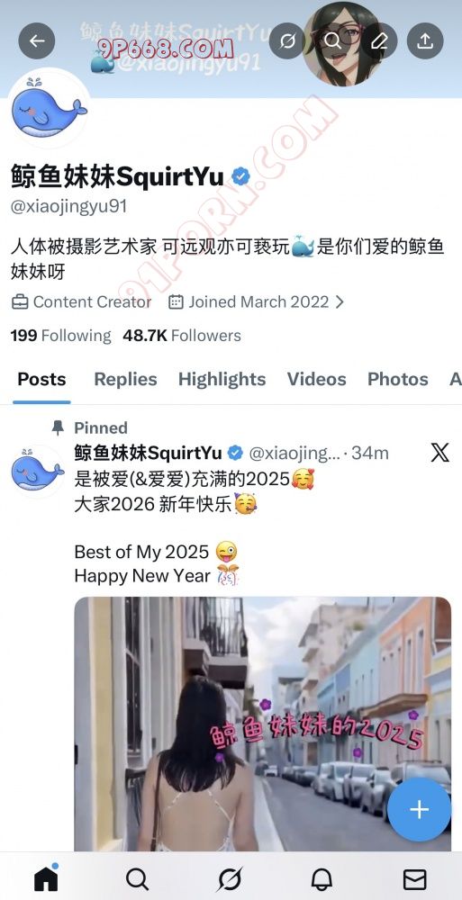 鲸鱼妹妹唯一的推特X账号:鲸鱼妹妹SquirtYu,@xiaojingyu91